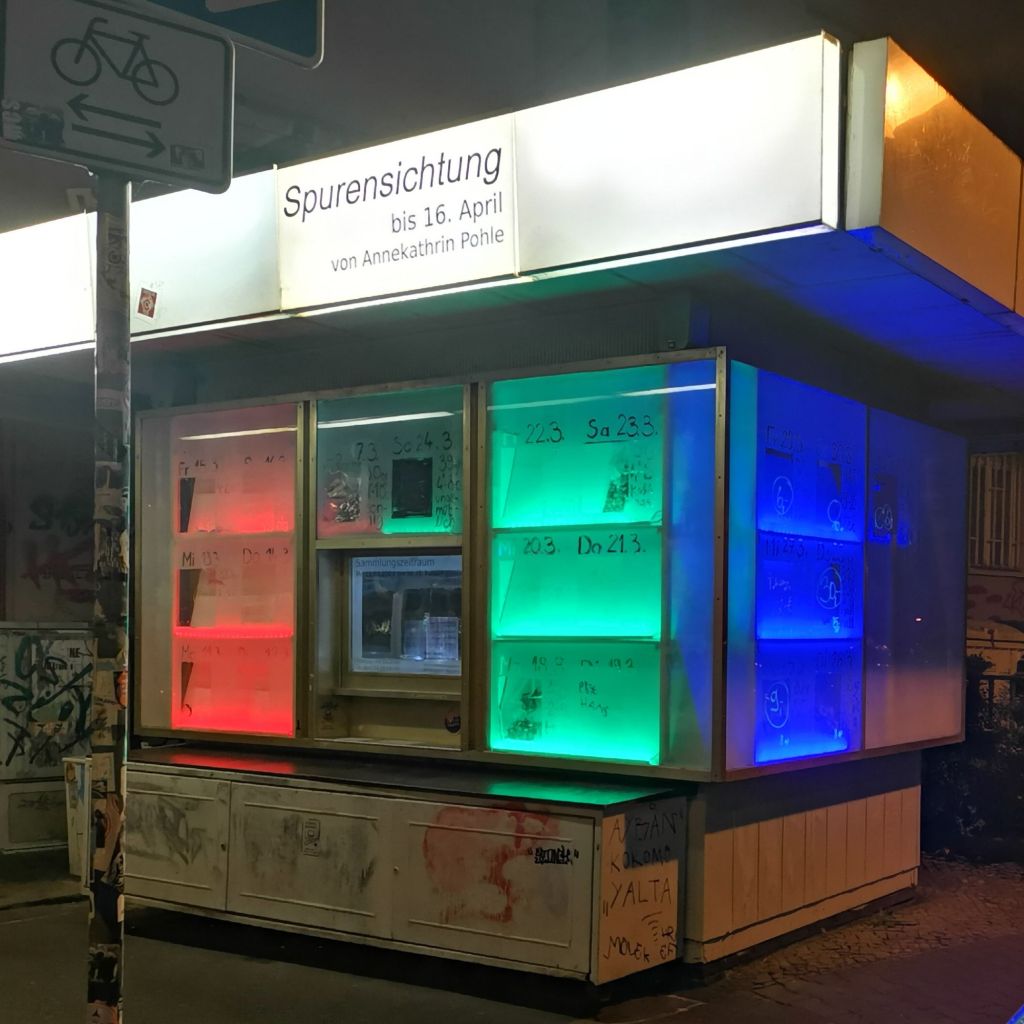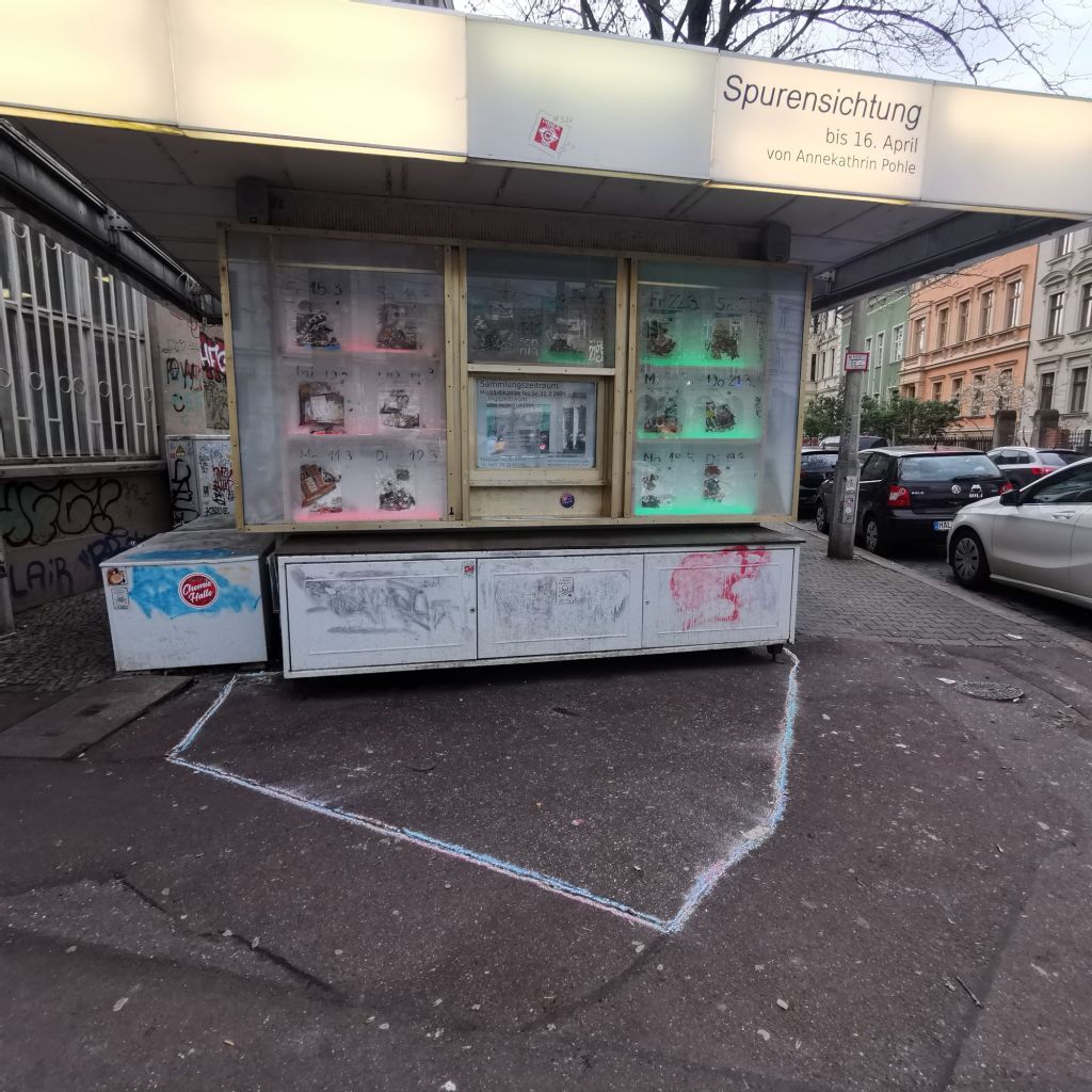 Über mehrere Wochen wurden am Kiosk die Überreste des Vortrags (und Vorabends) zusammengekehrt, dokumentiert und konserviert. Daraus entstand im Kiosk eine Installation – ein Kalender aus Weggeworfenem und liegen gelassenen, urbanen Artefakten.