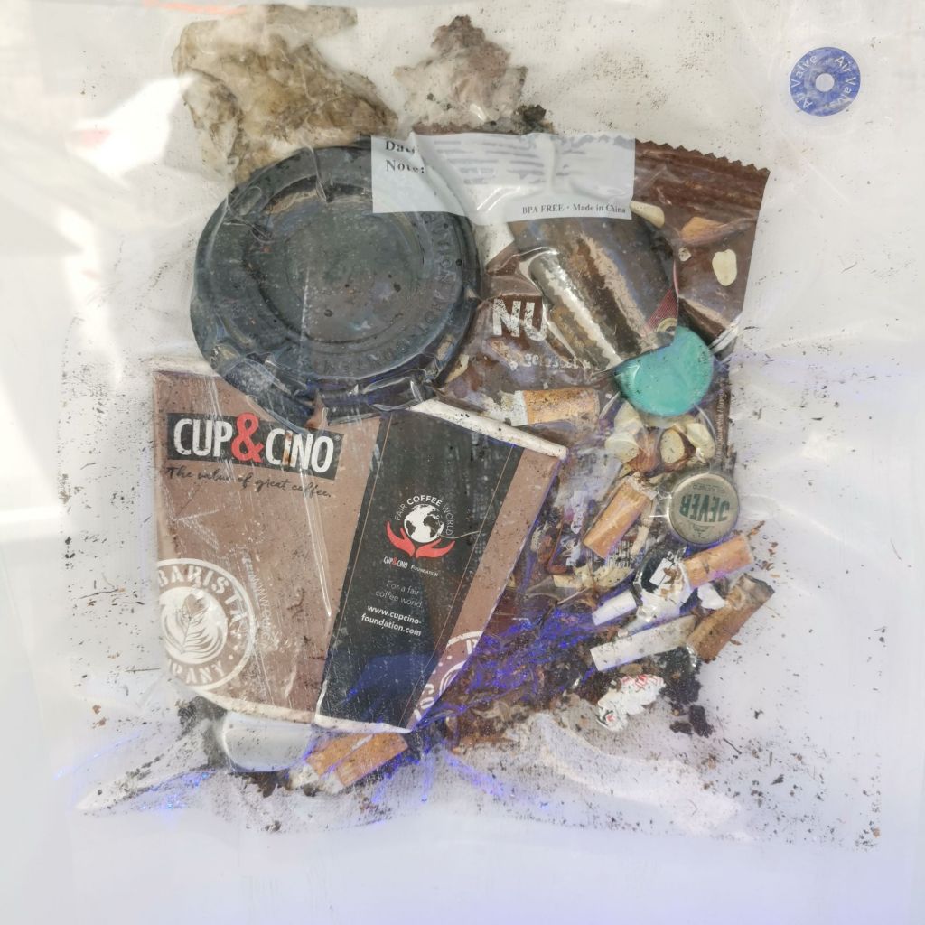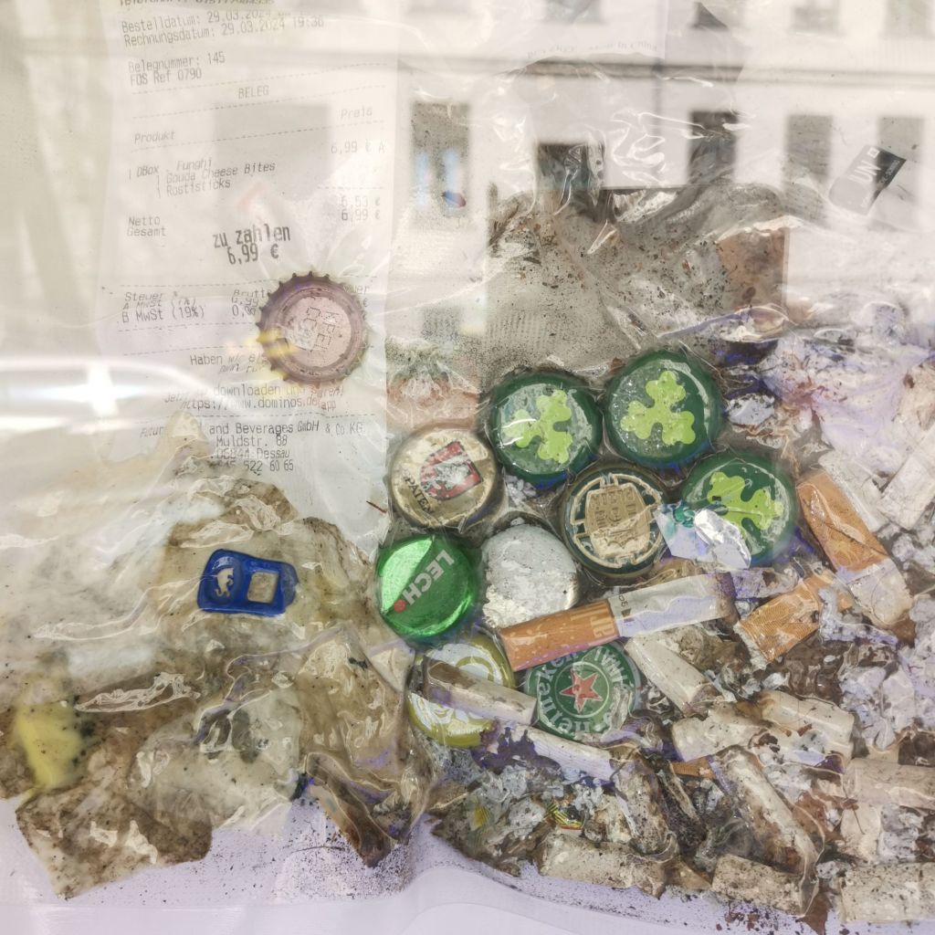 So konnte jeder eigene Fragen und Vorstellungen vom Leben am Reileck entwickeln: Wann bleiben Unmengen liegen und wann ist kaum etwas zu finden? Wann findet man eher Kronkorken und wann viele Pizzakartons? Wie lange dauert es, bis ein Tabakbeutel zusammenkommt – und ist das dort eigentlich der Einkaufszettel, der mir selbst aus der Tasche gefallen ist?